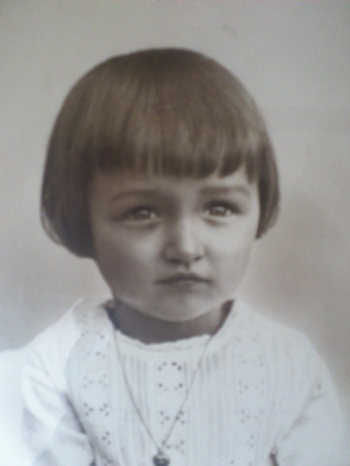 Der findes et gammelt fotografi af min mor fra den tid, hvor jeg endnu ikke var sat i verden. Det viser en lille pige på tre år, der lidt betuttet og skeptisk kikker ind i kameraets øje. Kjolen har et fint hæklet mønster og jeg forestiller mig, at hun har været stolt af at have den på til fotografen. Om halsen har hun et lille guldhjerte med en sten i midten. Det fik hun i dåbsgave og jeg har det liggende på mit arbejdsværelse i hendes mors gamle smykkeskrin. Fotografiet er i den gammeldags rød-brune farvetone, som vist i dag kaldes sepia og er blevet så moderne, at man kan indstille kameraet på sin mobiltelefon til at tage billeder i den nuance.