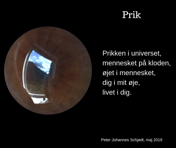 Prik Skriv en kommentar I morges så jeg ind i dit øje. Jeg må have været tæt på, for jeg så også himlen og universet. Del dette: Klik for at sende et link til en ven(Åbner i et nyt vindue) E-mail Klik for at udskrive(Åbner i et nyt vindue) Udskriv Klik for at dele på Facebook(Åbner i et nyt vindue) Facebook Like Henter...