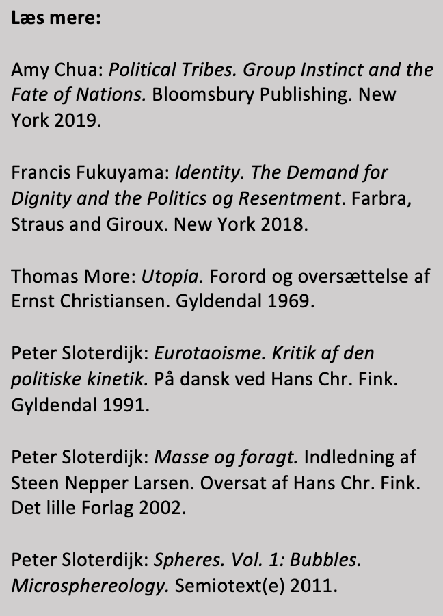 Mennesket er et stammevæsen; vores identitet og følelse af tilhør kommer fra de nære omgivelser og kun i begrænset omfang fra det større nationale samfund, og slet ikke fra det globale samfund. I den moderne verden betyder “det nære” imidlertid ikke kun det nære i fysisk forstand, som noget stedbundet. I cybersamfundet betyder nærhed også nærhed og tilhør i forhold til meninger, holdninger, oplevelser og identifikation. Det drejer sig om nærhed i forhold til andre, som synes det samme som én selv, og den slags nærhed findes langt hurtigere på de såkaldte “sociale” platforme som Twitter, Facebook, YouTube o.l. end i den virkelige sociale verden.