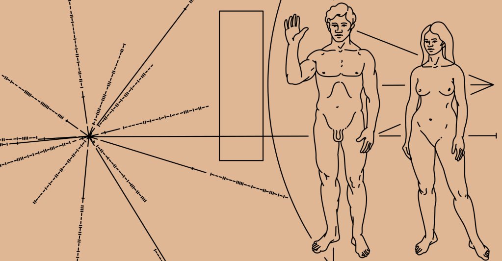 Kvinden har imidlertid intet, som kunne antyde eksistensen af en vagina, men ser ud som om hun er helt lukket mellem benene, nærmest som om hun mangler noget, f.eks. en penis. Det ville i hvert fald ikke være mærkeligt, hvis eventuelle rumvæsener skulle finde på at tolke afbildningen på netop dén måde. Og så vil de være helt på linje med størstedelen af den jordiske historie om kvindens og mandens anatomi.